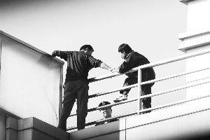 在该大厦楼顶的西南角,一男子站在楼顶护栏外,双手握着栏杆,并不时扭动着身体。为避免该男子情绪波动,警方一边劝说该男子,一边疏散围观群众。
