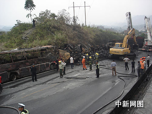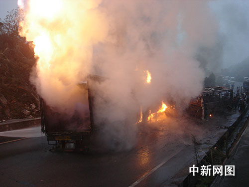 中新网南宁十月十八日电 (王刚 王越川)十八日凌晨三时许,广西南丹县境内发生四车相撞惨烈事故,造成包括大客车在内的三辆大型车辆被烧毁,至少十五人受伤,其中三人重伤。
