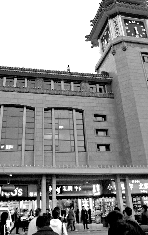 一女孩站在北京站主楼顶上。昨日17时40分许,一名十八九岁的女孩从北京站六层楼顶跳下。目击者称该女孩为安徽学生,跳楼前曾给车站内的同学打电话。事发后,该女孩被送医抢救,其同学被警车带走协助调查。(读者 鲁峰 本报记者 吴昊亮 摄影报道)