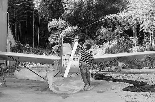 昨天是张全清的飞机首次试飞。经过反复调试后,他跳上飞机发动。