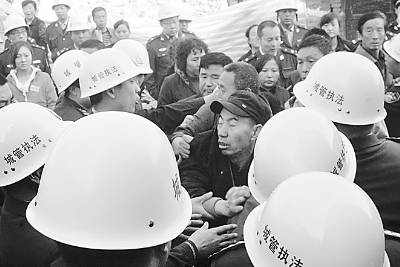 就在这时,眼看房子就要被拆掉,在一旁围观的3名村民显得很激动,他们将挖掘机围住,并将挖掘机司机拉下了车。为了防止发生意外,执法队员站成一道人墙阻止村民进入。但是村民并没有罢休,而是开始破口大骂,并强行冲击人墙,试图进入砖块乱飞的拆迁现场,现场情况一度很紧张。在执法队员的极力阻止下,村民才没有冲入拆迁现场。