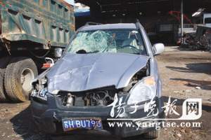 昨天上午在停车场,记者见到了肇事车辆:牌照为苏HBU790双环越野车,前挡风玻璃半边差不多被撞碎,上面还有一个大洞,直径为49厘米,并且从碎裂的玻璃缝隙中提取了数根头发。从车内名片盒内,记者找到一张杜军本人的名片,上面写有“志圣科技(广州)有限公司苏中地区经销部工程师”字样。据楚州区公安局交警大队办公室主任朱士能介绍,昨天上午杜军血检结果显示,他属于醉酒驾车,应负事故全责。警方同时已安排人员到杜军家让他们尽快先拿出10万元来做死者家人的安抚工作。一名不愿透露姓名的民警告诉记者,从事故发生时间以及杜军的血检结果来看,杜军应该是中午喝的酒。他同时告诉记者,该车在事故发生前还有一起闯红灯,两起违停行为。