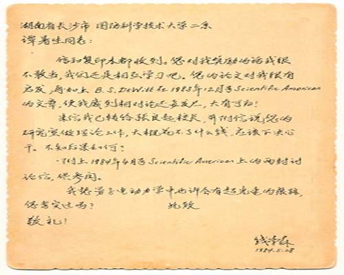 钱学森在1996年5月19日写给谭暑生的最后一封亲笔信中说:“对您近年来的不断探索精神,我要表示敬意!但我非此道行家,不能再说更多的话……”