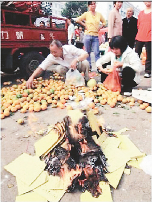 李谋辉的家人急于准备安葬老人的后事,把没有卖掉的2辆三轮车上的柑橘、苹果等水果作2毛钱一斤低价处理,吸引许多群众抢购。围观的群众看到这么便宜的水果,加上主人心思不在这上面,开始哄抢。有的人给了一两元钱,更多的人则是看到没有人问要钱,拿起水果就走人。半个小时,连买带拿,大约700多公斤水果被一扫而空。