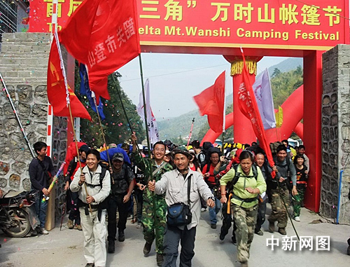 在万时山上,记者看到五湖四海的驴友身穿色彩各异的登山服,背着硕大的旅行背囊,不少人手里还拿着专业登山用的拐杖,在领队的带领下浩浩荡荡沿着林中的栈道逆溪而上。