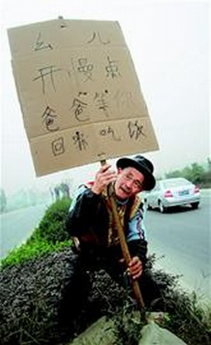 黑幕降临,成青金快速通道梁胜村路口边的平房内,32岁的廖大姐正在灶房里做饭,5岁的女儿唱着歌溜出屋。突然一阵刺耳的刹车声响起。廖大姐如触电一般,手中菜刀坠落在地。奔出门外,见女儿并未走近路口,一把将其紧紧抱住……3天内,这个路口就吞掉了两条人命。两年多来,仅梁胜村就有8名村民在此路口丢了性命,被称为“死亡路口”,在反映10余次无果后,昨(8)日,该村60岁的“弼马温”董永发将亲手制作的警示牌立在了路口:“幺儿,开慢点,爸爸等你回家吃饭!”
