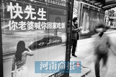 郑州的农业路、文化路、二七路等繁华路段、公交站台新近出现了许多广告牌,什么“肛肠泌尿”、“丰胸整形”、“无痛流产”……种类繁多,最引人注目的是一个画面上一位妙龄女士在大喊“快先生,你老婆喊你回家吃饭”的广告。