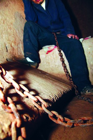 在这间5平方米左右的小土屋里,土炕占去了几乎一大半的空间,屋内左侧一块宽大的水泥板上,系着一根粗长的铁链,5米左右的铁链另一头死死地锁在张永成的腰部,他的小肚子因铁链的紧勒,有些深陷。