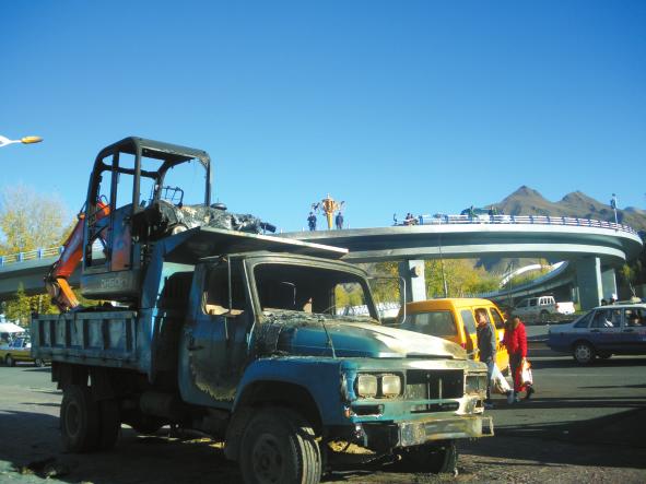 记者在事故现场看到,一辆被烧成空架的东风车及被烧过的装载机放置在路边,立交桥的栏杆已被撞出一个宽大的口子,桥下3柱景观路灯也被烧坏。桥下地面还残留着大片油渍,旁边被大火殃及的工商部门办公楼烧毁严重。清理现场的工作人员正在对一些危险建筑物进行拆除,并对现场油污进行清理。