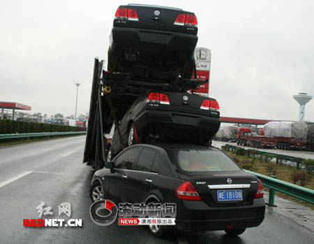 当日下午4点20分左右,高速交警邵怀大队隆回中队民警黄始杰、罗权赶到事发现场,在由东往西方向的洞口服务区入口处,一辆牌号为湘E1B1**的尼桑小车一头撞进牌号为吉A955**的挂车尾部,将挂车车尾所装载的捷达小车高高的顶起,而尼桑小车的左前轮在剧烈的撞击下已经破裂。