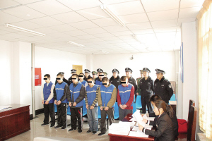 连环抢劫团伙“带头大哥”很年轻,个体烟酒店和独居老妪成为受害者,红桥区检察院以抢劫罪、盗窃罪、掩饰隐瞒犯罪所得罪对该团伙提起公诉。昨天上午,此案在红桥区法院公开审理,近20名法警和武警将该案8名被告人押解上庭。