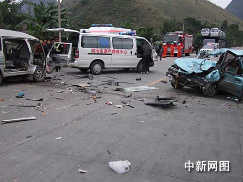 中新网河池11月20日电 (范思奇 李勤政 王刚)11月20日上午6时许,广西河池市境内,一辆出租车与面包车猛烈对撞,造成1人当场死,4人不同程度受伤,面包车车头被撞去一半。