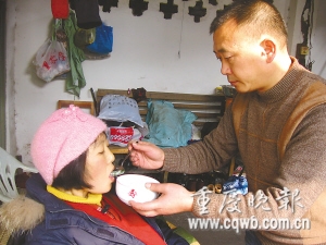 为弥补自己的“过失”,张兵背着蒋翠四处借钱为她治病。1年来,在龙头湾康田小区当保安的他,为省钱给蒋翠治病,40分钟的路程,他每天来回步行。除了上班,他每天给蒋翠喂饭、洗衣,端屎倒尿,从无怨言。现已花去了十二三万元,蒋翠的病仍无好转。