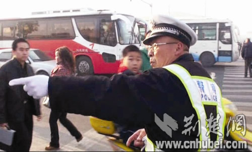昨(25日)晨,60多岁的河南籍徐爹爹步出武昌火车站时,见中山路上行人乱穿,车辆抢行,心急如焚的他立即戴上交警的大檐帽,穿上警用反光背心,现场指挥疏导交通。