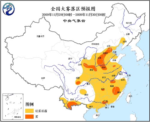 预计29日早晨到上午,西北地区东部、华北中南部、辽宁中部、黄淮中西部、江淮大部、江汉、江南大部、华南大部以及四川盆地大部、重庆大部、贵州西北部、云南南部等地有轻雾,其中,北京南部、天津、河北中部和西南部、山西中南部、河南中部、陕西中部、四川盆地南部、湖南中部、江西北部和东部、福建西部、广东中部、云南南部等地的部分地区有能见度小于1000米的雾,局地能见度不足200米。
