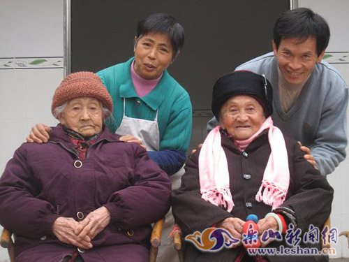 乐山市中区青平镇传有一段佳话:宝兴村的王云清大孝感天,赡养的两位百岁母亲因此福寿延年,身康体健。母亲李叔华,94岁,岳母李玉容,100岁,两位寿星竟同降一屋。12年来,这对亲家母在子孙们的供养下形同姐妹,朝夕相处,尽享天伦之乐。