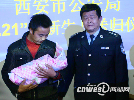 备受公众关注的西安交大一附院丢失女婴今天终于回到了父亲严小红的怀抱。今天(12月2日)下午西安市公安局专门举行送归仪式将女婴交给他的父亲严小红,西安市公安局通过DNA鉴定,确定女婴为严小红和张兰芳的亲生女儿。