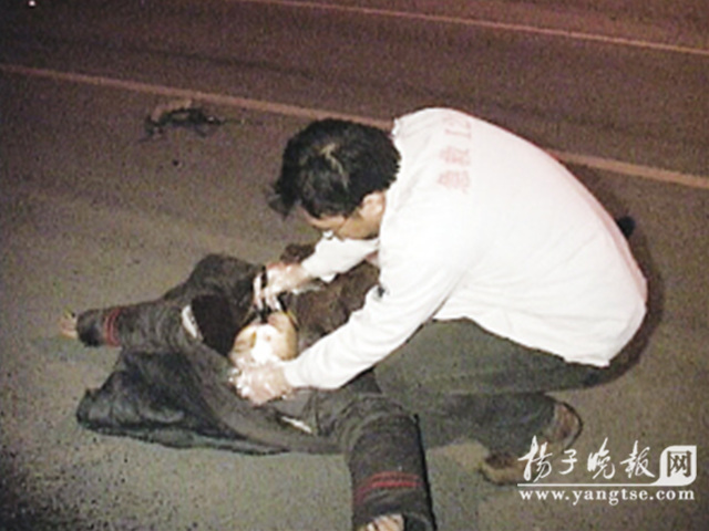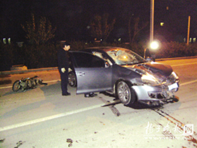 昨天凌晨0点35分,一辆由南向北行驶在南京扬子江大道上的银灰色速腾轿车,在开到定淮门大街的路口时,突然将一名骑助力车身着保安制服的男子撞飞40多米外的车道上。顿时被撞保安不省人事。事情发生后,110民警接到报警立即通知了120救护车及交警五大队到场处理。很快,民警临时用路障将现场进行保护,此时,那名穿着保安制服的中年男子仰面倒在地上,这名保安是南京鼓楼区保安公司的保安万德华。医护人员将他抬上车就近送往南京医科大学第二附属医院抢救。