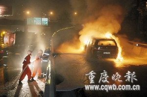 很快,消防特勤二中队官兵奉命赶赴现场。由于泄漏的柴油满地都是,熊熊火焰很快蔓延,不仅将广本轿车包作一团火球,还烧成一片火海,形成一堵“火焰墙”,阻断了凤鸣山至杨公桥路段的过往车辆。