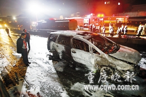 消防官兵奋战半小时后,终将大火扑灭。此时,广本轿车已烧成光架,与之相邻的福克斯轿车,也有局部被烧毁。但油罐车成功保全,无人员伤亡。