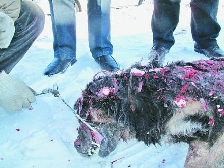 只见,父亲的脖子和脸上血肉模糊,全是鲜血。脖子处,喉咙和皮肉都没有了,只剩下一根骨头连着身体和脑袋;头部、脸上已无皮肉,两个眼珠和耳朵也不见了踪影,头发下面只剩一颗血淋淋的骷髅,下面白色的积雪早已被鲜血染红,已经与头颅冻结到了一起。此时,父亲张明的身体已经僵硬。