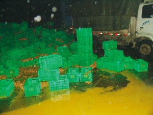 昨天晚上6点钟左右,一辆满载数百箱鸡蛋的货车,在途经省城清河北路附近的时候,突然出现了故障,无奈只能叫来了一辆新车,并将鸡蛋一箱一箱转移到了前来援助的中型卡车上,做完交接后,新车继续向目的地出发。昨天省城下着蒙蒙细雨,司机刚刚开出不到一公里,由于地面湿滑且路况不佳,车辆在一次刹车过程中,车内的数百箱鸡蛋因惯性一下子冲破右侧护栏,撒到了地上。