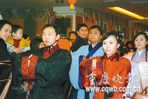 昨中午,在长寿区某宾馆,一场传统汉式婚礼举行。婚礼中,司仪说起了文言文,部分来宾听得云里雾里。
