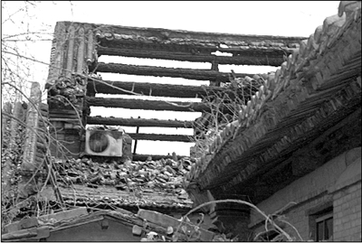 下午5点,记者绕到人民大学印刷厂西侧的61号院。与院子仅一墙之隔的西配殿木质结构的椽子已经被烧得焦黑,砖瓦的棚顶只残存了很少的一部分,房顶东侧的房梁已经依稀可见。