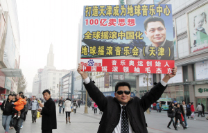 一款黑墨镜,一袭黑风衣,昨天(12月13日),当一位长相颇似著名影星周润发的外地男子出现在(天津)和平路上时,引起了不少人的注意。而当他高举起一幅广告牌的时候,更有不少人对他的精神状况产生了怀疑。“打造天津成为地球音乐中心”、“100亿卖思想”,远远看着广告牌上这些“雷人”的宣传语,大伙儿不敢靠近。