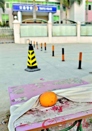 在交警中队大楼的大堂里,陈录生的照片仍然挂在公告栏内,相片与十几名“初级警员”排列在同一行,但职务一栏已成空白。而在大楼对面,记者看到陈录生家属设置的“灵堂”仍未撤走,灵堂由一个蓝色的架子搭建而成,架子下摆着一张小桌子,桌子上还有几个水果。桌子旁边则有一个炉子,地上还残留着爆竹。