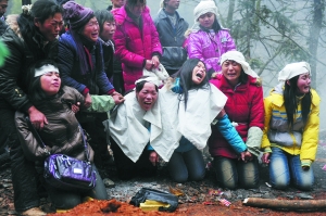 正午十二点,六七家失去亲人的家庭都放起了鞭炮,敲起了锣鼓。