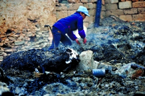 刘奶奶的棺木,被吃力地放下土坑,沉重的棺木里,是老人轻微的尸骨———老人的尸体已在刘爱兵放的那把烈火中烧毁,亲人们只寻到些许碎骨。