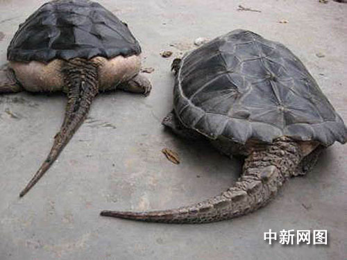 于先生把两件“宝物”拿到室外让我们观赏。由于时下已是冬季,它们正处于半冬眠状态,趴在地上慢慢蠕动,对围观的群众投以好奇的目光。个头较大的那只,不停张嘴觊觎着四周。经仔细观察,其长相集龟和鳄鱼于一体,尤其是粗壮的尾巴,与鳄鱼的尾巴无疑。体长一尺有余,背壳直径二十多厘米,上有三条凸起的三角形棱脊,并有放射状斑纹。头部较粗大,不能完全缩人壳内,脖短长有褐色肉刺,尾巴尖而长,长有肉突刺,爪子尖而有力。