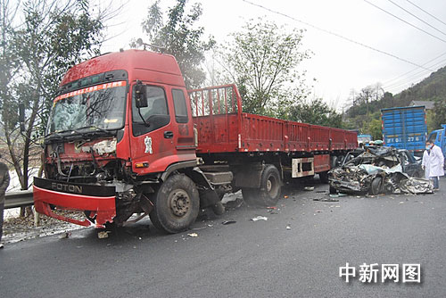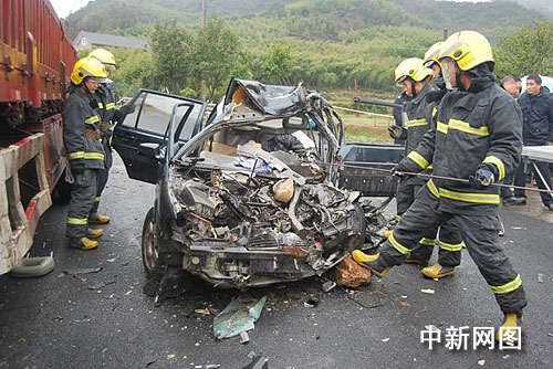 中新网杭州12月15日电(记者 江耘 袁爽)今天中午一时三十分许,浙江杭州临安市板桥乡平峰村口的公路上发生一起车祸,一辆小轿车从村口出来时遭大货车的猛烈冲撞。事故造成了小车内五人中的三人当场死亡,两人受伤。一旁的一名路人也被殃及受伤。
