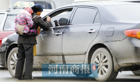 昨日上午10时,郑州市郑汴路与中州大道交叉口,车辆川流不息。每当红灯亮起,就会有十几名妇女来到十字路口,用鸡毛掸或是抹布给排队等红灯的车擦车窗或反光镜。有个妇女还抱着孩子,手里举着一块钱钞票。跟随她们的还有一个五六岁的小女孩,穿着蓝棉袄、花布鞋,一张小脸冻得通红。小女孩举着一张一元的钞票,麻利地穿行在车流中,敲着车窗要钱。