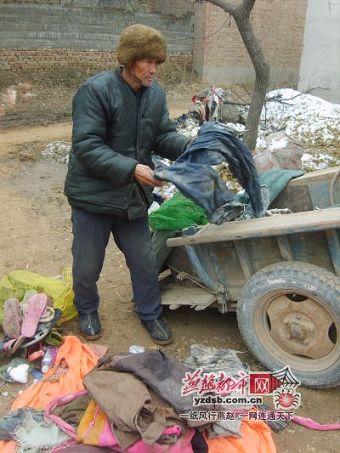 在收养丽福的第二年,妻子精神失常。养家糊口的重担落在他一个人肩上。村头、路边、建筑工地、小区的垃圾堆旁都有他捡破烂的身影。尤其夏天,垃圾堆臭气熏天,苍蝇乱飞,他仍不断刨着,将别人扔弃的纸杯、费报纸、酒瓶、旧鞋、破衣服当宝贝似地捡入自己背囊中。冬去春回,他捡破烂从天命之年一直捡到古稀之年。
