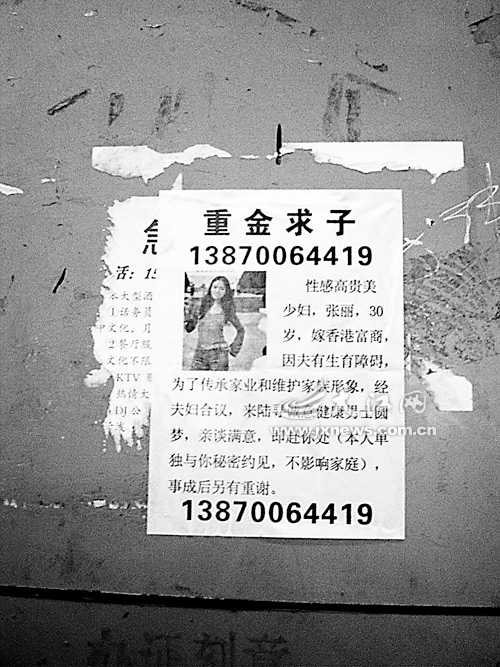 没费多少时间,记者便在某临街店面的外墙上看到了这则广告,内容为“性感高贵美少妇,张丽,30岁,嫁香港富商,因夫有生育障碍,为了传承家业和维护家族形象,经夫妇合议,来陆寻诚意健康男士圆梦,亲谈满意,即赴你处(本人单独与你秘密约见,不影响家庭),事成后另有重谢”,广告上还配有一张美女全身照,更是吸引了不少市民的眼球。围观市民为此议论纷纷,有的说可能是真的,现如今无奇不有;还有的说,这种事怎么可能广而告之,肯定是骗子设的圈套。