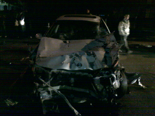 记者在现场看到,二层桥面快到坡底的隔离栏已经完全撞破,开出一个大约25米的缺口,而白色轿车则停在离隔离栏缺口约50米远的地方,车头等部位受损严重几乎接近报废。轿车驾驶员瘫坐在人行道边,有轻微的受伤,身披一件警用大衣,但不见肩章和警号,身上散发着浓烈的酒气,对于民警的询问几乎无法正常作答。