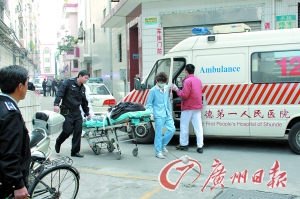“送他去医院!”民警的话音刚落,6名医护人员合力把该男子抬上了担架。