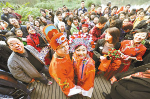 下午5时,巴国城公园凉亭,唢呐锣鼓齐鸣,来自美国堪萨斯州的新郎乔纳森头戴纱帽、身穿大红官袍登场,重庆新娘徐闪凤冠霞帔,脸颊微红。新人亮相,亲友阵阵欢呼,“洋婆婆”上前拉着儿媳妇的手,激动得不住地说:“You are beautiful girl(你是一个美丽的女孩)……”