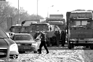 昨日下午1时,八达岭高速路水屯出口处,出京方向,大货车排成约20公里的长龙,前后看不到尽头。由于长时间没有挪动,一些司机或下车探路或在车上睡觉。交警介绍,目前水屯路口积雪清理完毕,车辆今日可完全疏散。据了解,累计数千辆大货车因雪被困在此两日夜。