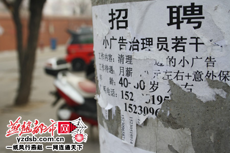 在红星里社区的一个电线杆上,记者发现了网友所说的“最牛小广告”。虽然广告被撕去大半,但依稀能够看到“工作内容为清理路边小广告,待遇为工资加意外伤害保险”等字样。