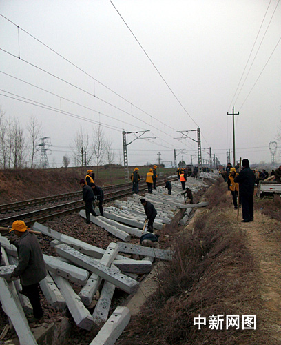 记者今日下午15时许在抢险现场看到,事故现场位于伊川县彭婆镇东高屯村,洛阳环城高速桥下。紧急架设的4条抢险通讯专线北段值班人员,正在汇报列车脱轨事故情况,相撞的农用车、客运列车已被拖离现场,郑州铁路局从局属各单位抽调的运送物资车辆进出有序,千余名铁路职工正在紧张抢修被毁坏的500余米铁路。