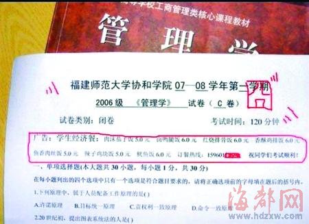 昨日上午,记者在福州海角社区论坛上看到这个热帖,并附有一张印有菜单广告的试卷照片。试卷顶部写着“福建师范大学协和学院07-08学年第一学期2006级《管理学》试卷以及试卷类别和考试时间”等字样。但紧接着,就印着两行“学生经济餐”广告,还有订餐电话。最后,还写着“祝同学考试愉快”,令人哭笑不得。