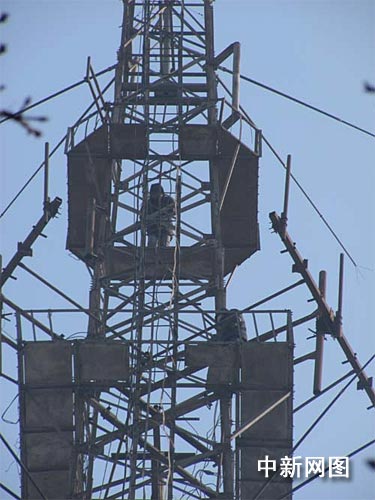 中新网哈尔滨1月14日电 (肖劲彪)今天9时许,在哈尔滨市香坊区和平路171号,三名农民工为了讨工钱爬上70余米高的信号发射塔上,在零下20℃的气温下呆了近9个小时,最终经过各级政府的协调,3位农民工在消防官兵的协助下安全返回地面。