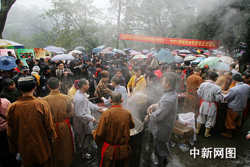 中新网重庆1月22日电 (孟幻)今天是中国农历腊月初八,天空虽然飘着小雨,有些许寒意,数万山城市民仍是涌入当地华岩寺喝腊八粥,过腊八节,期望来年增福增寿。