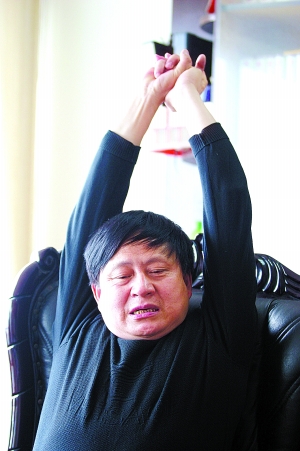 去年12月20日,北京一家宾馆内,周立太撩起保暖内衣,晨光通过窗户,射在圆滚滚的肚子上。