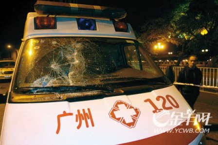 记者接报赶到现场,在沿江西路中山大学附属第二医院大门前,一辆车身喷有“广州紫荆医院”字样的救护车停在路边,车头的挡风玻璃和右前门玻璃被砸烂,地上还留有砸车用的砖块。紫荆医院司机李先生虽然没有被打伤,但是情绪还很激动。他告诉记者,他们接到电话称,有病人需要救护车转送茂名,救护车在中山二院门口刚停下来,“前后各一台越野车便把救护车夹住,车上冲下来十多人,有人手上还拿着砍刀。”