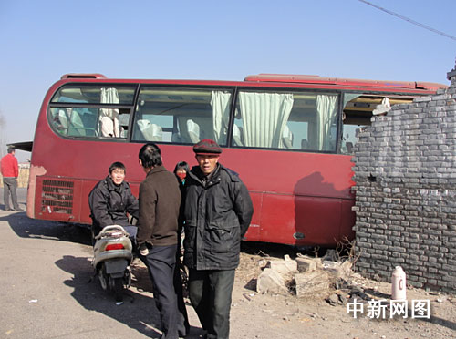 据现场目击者称,大客车是与当地司法部门的小型轿车发生碰撞后,由于车速较快,大客车猛然冲进公路旁的民房内,所幸屋内没人,民房被撞一角严重受损,墙体坍塌。