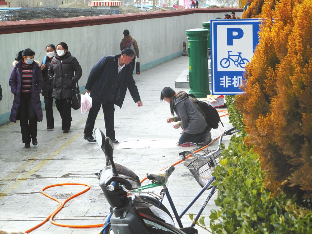 25日下午17时许,两个15岁左右的女孩跪在北京中路邮电局前面的人行道上,以为母治病为名向来往路人乞讨。附近一些商户以及行人纷纷慷慨解囊,伸出援助之手。(王景莲)